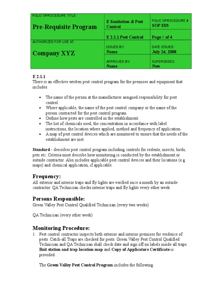 (PDF) Sample SOP Pest Monitoring, Management, and …33401F43 Sop For Pest Control In Food Industry Pdf 2016 pest management standards for food processing and handling facilities. pest control procedures in the food industry. pest problems in food related facilities management of pests in food processing facilities requires a high degree of. When do you check for. the aim of the cop is to provide a reference document for use by pest managers. Sop For Pest Control In Food Industry Pdf.